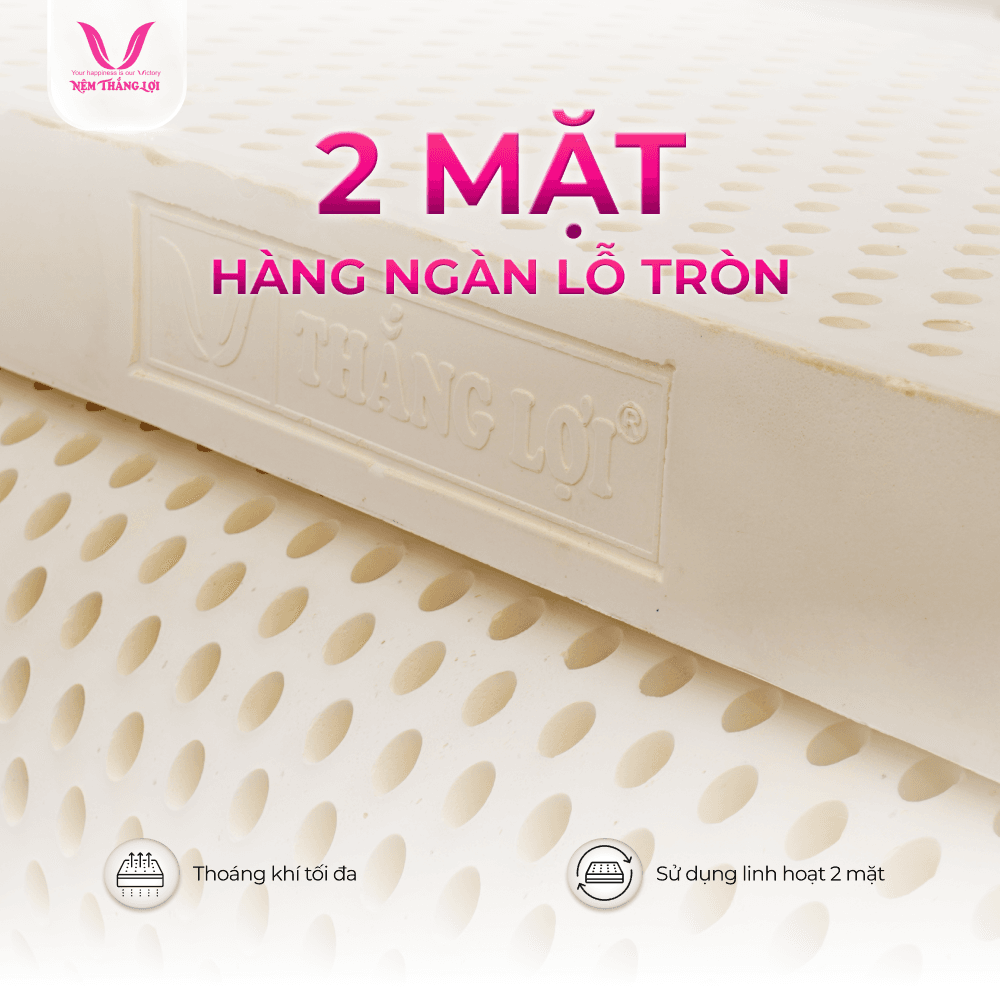 Nệm 100% Cao Su Thiên Nhiên Thắng Lợi TiTi Double Function được thiết kế với hai mặt lỗ tròn và một khối đặc, điều này cho phép bạn sử dụng cả hai mặt của nệm. Khi một mặt đã qua thời gian sử dụng và có dấu hiệu mòn, bạn có thể lật sang mặt kia mà vẫn giữ được cảm giác êm ái, chắc chắn.