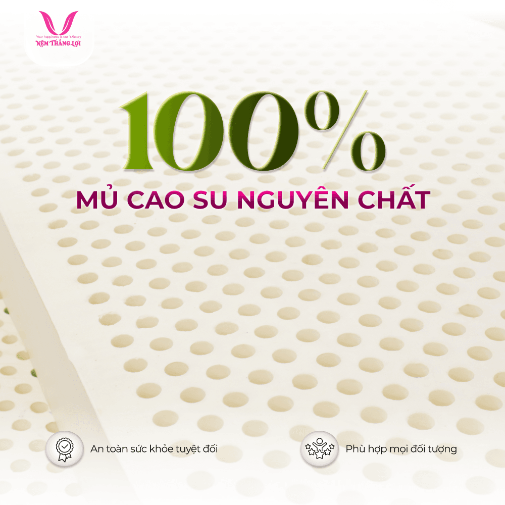 Nệm 100% Cao Su Thiên Nhiên Thắng Lợi TiTi được làm hoàn toàn từ mủ cao su tự nhiên chất lượng cao được thu hoạch trực tiếp từ Tây Nguyên. Trong quá trình sản xuất không sử dụng bất kỳ hóa chất độc hại nào tránh được nguy cơ gây ra vấn đề dị ứng, kích ứng da hay các vấn đề sức khỏe nghiêm trọng khác đảm bảo an toàn sức khỏe người dùng.
