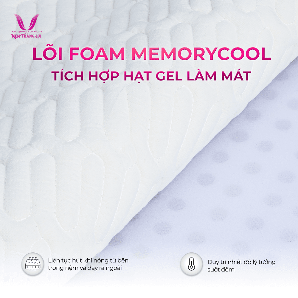Lõi nệm điều hòa Thắng Lợi Vitamin Cool được làm từ foam MemoryCool, một loại foam cải tiến tích hợp các hạt gel làm mát bên trong. Foam MemoryCool không chỉ mang lại độ êm ái mà còn tối ưu hóa luồng khí lưu thông.
